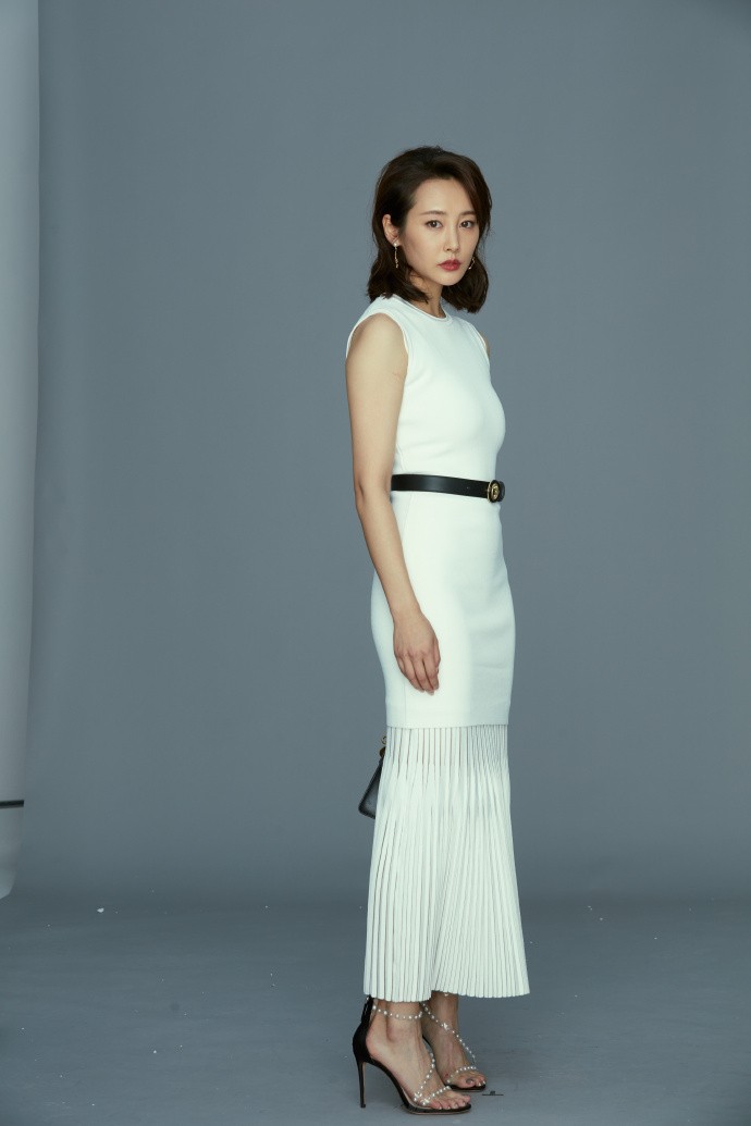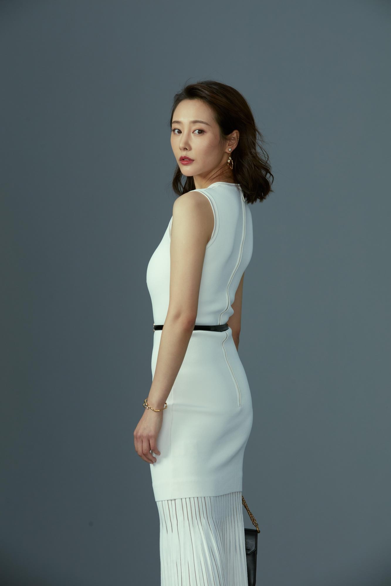 李纯正面端坐,双手自然交叠于膝上,白色包臀裙在膝盖处收束,展露匀称小腿,笑容温婉目光柔和