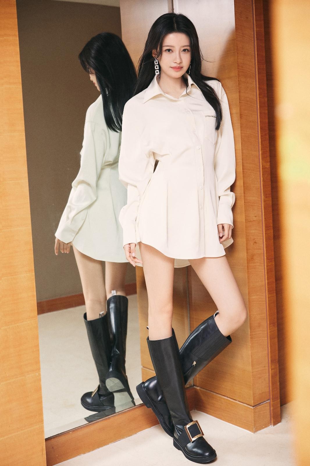 造型的亮点之一,在于孙怡对长筒靴的极致驾驭。她巧妙运用了不同款式、颜色和材质的靴子,与服装碰撞出多元火花。其中,一套深褐色背心连衣短裙搭配白色长筒靴的造型,堪称经典。柔软的靴筒紧贴腿部线条,不仅没有丝毫臃肿感,反而将她的双腿衬托得愈发纤细流畅,行走间仿佛“人间建模腿”从虚拟照进现实,每一步都踩在了时尚的脉搏上。另一套初春学院风造型中,她则以红黑条纹毛衣内搭白衬衫,下身搭配黑色高筒马丁靴,帅气中洋溢着青春气息,被粉丝惊呼为“学姐好”。长筒靴在她身上不再是单纯的保暖单品,而是勾勒腿型、提升气场、定义风格的关键时尚符号。